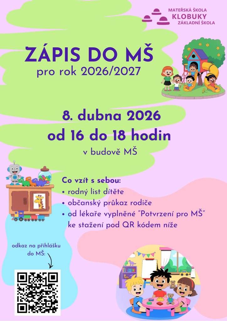 8.4. 16:00 - 18:00 zápis do MŠ 2026/27